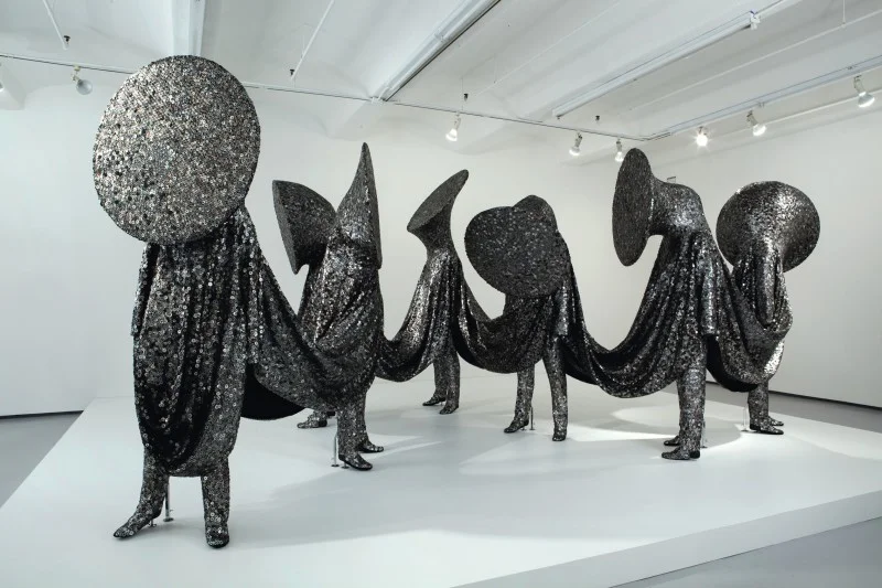 Nick Cave’s monumental installation Speak Louder invokes one of the artist’s favorite dictums: In order to be heard, you have to speak louder. The work unites seven of Cave’s iconic Soundsuits in one powerful ensemble – under a shimmering cloak of pearlescent buttons bringing individuals together into a figurative landscape. Cave draws strong visual parallels between the collected Soundsuits and the jazz-funeral processions of New Orleans, which often feature similarly spectacular outfits and lively brass marching bands. Here the figures’ tuba-shaped heads have been silenced, the mouths sealed off with dark fabric, imbuing the work with an ominous quality. Positioned in an array, but unified as one, Speak Louder forms a dynamic chorus, emphasizing the resilience of community. It speaks somberly to our losses – and encourages us to continue fighting for a better future.
